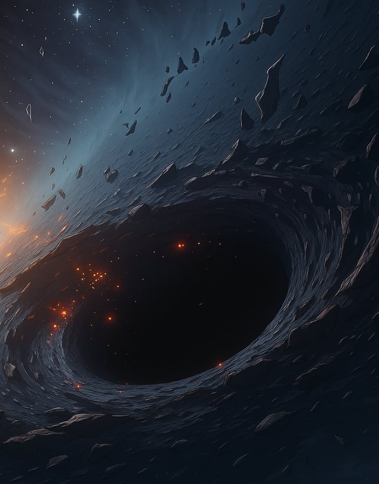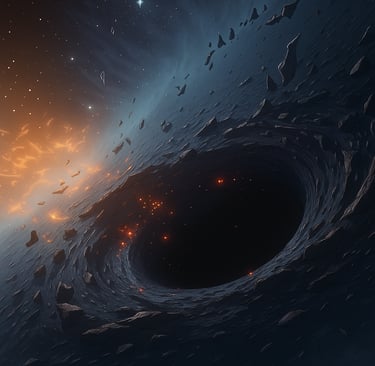 Atlas reached for control, but the ship had already begun to defy logic, Hana’s eyes tracked the descent in silence and calm, her body braced before the ship even tilted. She had seen this in data before, when certain structures refused to be mapped. Zones that were not broken, but protected. This broken place did not want to be entered. Below, the stone opened; A hole in the world, vast, perfect, circular, filled with absence, like memory traveling space.
